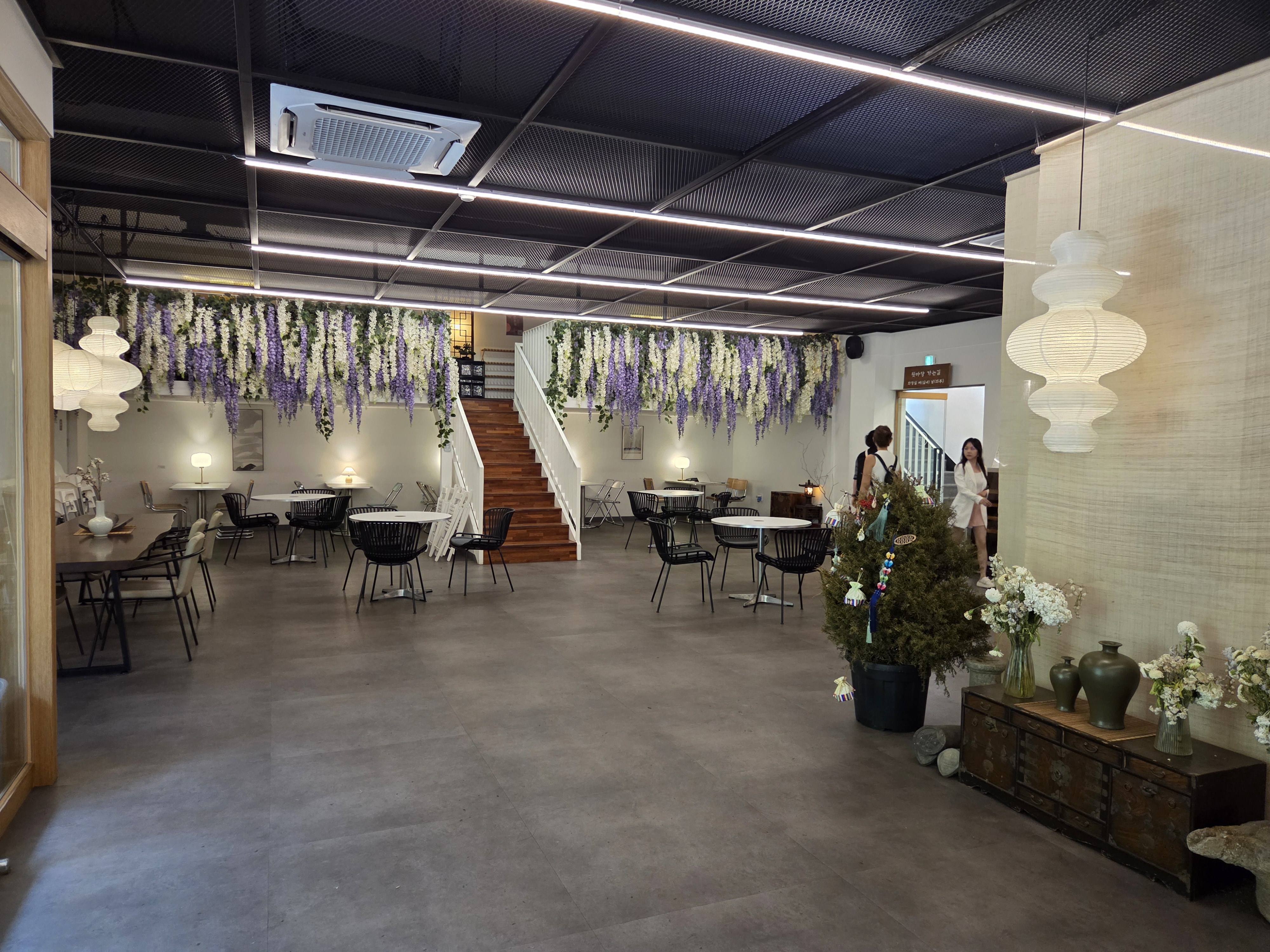입구에 들어서서 내부를 둘러보는데, 왼쪽의 칙칙한 복층 난간을 장식하고 있는 보라색 꽃들이 빛을 내고 있어서, 내부 곳곳에 장식되어 있는 전통 진열장이 전혀 지루하지 않을 수 있었다. 우리는 카페 직원에게 우리가 알고 있는 대로 반려견들을 카페 내부에서 리드줄을 착용한 상태로 내려놓을 수 있는지 확인하고 커피를 주문하고, 보라색 꽃이 장식되어 있는 복층으로 올라가 자리를 잡았다. 충분히 휴식을 취하고 우리 아가들 산책을 잠깐 시키려고 카페의 후문을 통해 외부로 나갔다.
